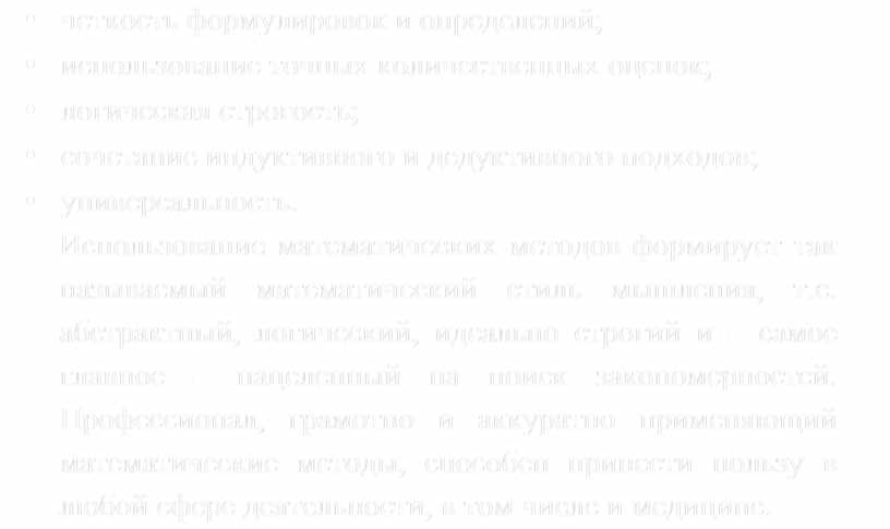 Причина, по которой без математических методов сейчас не обходится не только техника, механика, электроника, экономика, но и медицина, экология, психология, социология, лингвистика, история, юриспруденция и др., проста – для математических методов характерны: