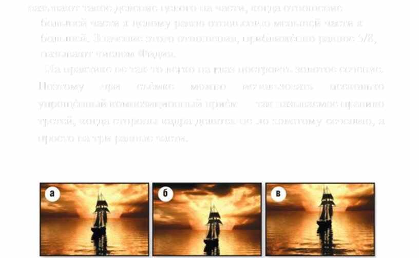 Выбрать точку расположения объекта съѐмки помогает знание золотого сечения. Напомним, что золотым сечением называют такое деление целого на части, когда отношение большей части к целому равно отношению меньшей части к большей. Значение этого отношения, приближѐнно равное 5/8, называют числом Фидия.
