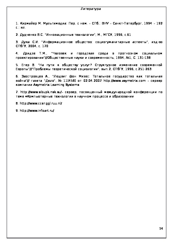 1. Кирмайер М. Мультимедиа: Пер. с нем. – СПб.: BHV – Санкт-Петербург, 1994 – 192