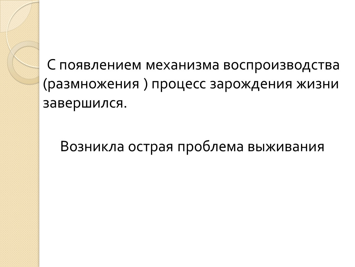 С появлением механизма воспроизводства (размножения ) процесс зарождения жизни завершился.