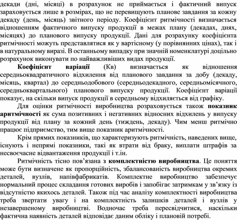 Для оцінки виконання плану по ритмічності використовуються наступні показники: коефіцієнт ритмічності; коефіцієнт варіації; коефіцієнт аритмічності.