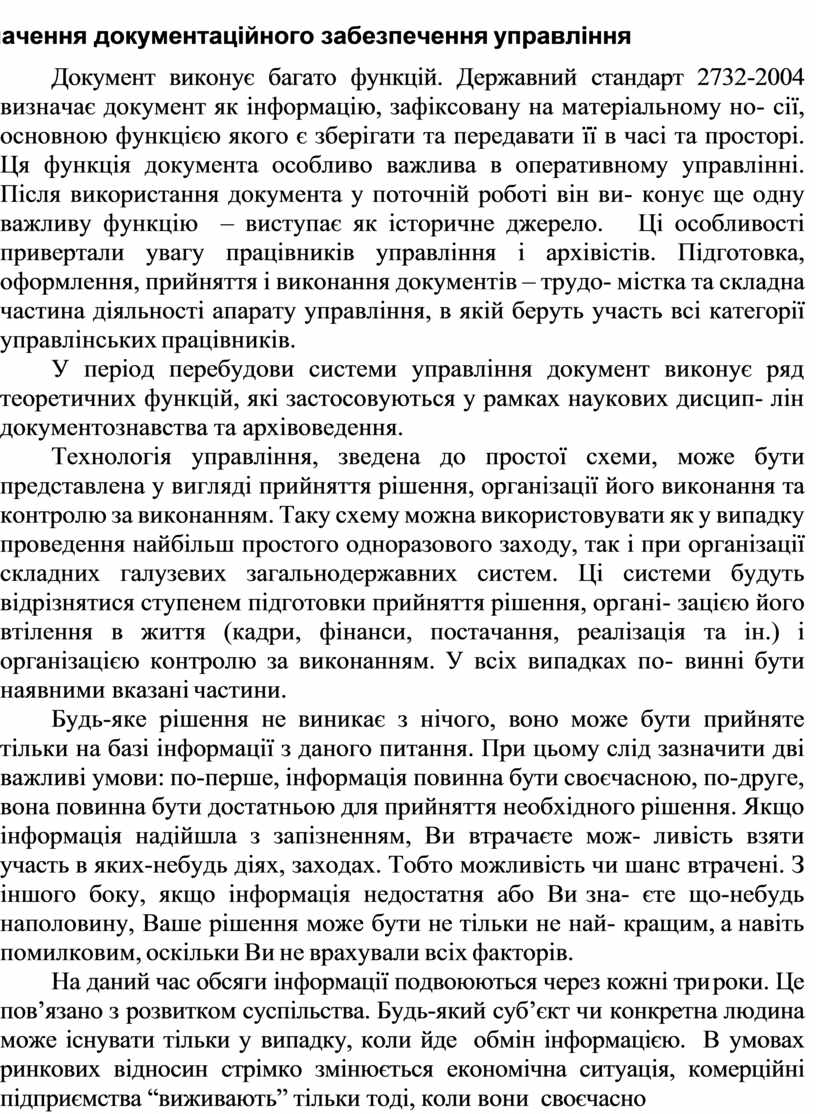Документ виконує багато функцій. Державний стандарт 2732-2004 визначає документ як інформацію, зафіксовану на матеріальному но- сії, основною функцією якого є зберігати та передавати її в часі та просторі. Ця функція документа особливо важлива в оперативному управлінні. Після використання документа у поточній роботі він ви- конує ще одну важливу функцію – виступає як історичне джерело. Ці особливості привертали увагу працівників управління і архівістів. Підготовка, оформлення, прийняття і виконання документів – трудо- містка та складна частина діяльності апарату управління, в якій беруть участь всі категорії управлінських працівників.