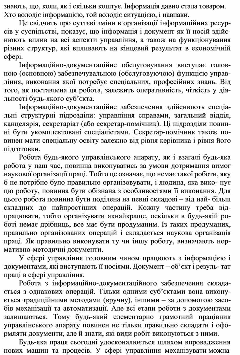 Інформаційно-документаційне обслуговування виступає голов- ною (основною) забезпечувальною (обслуговуючою) функцією управ- ління, виконання якої потребує спеціальних, професійних знань. Від того, як поставлена ця робота, залежить оперативність, чіткість у дія- льності будь-якого суб’єкта.