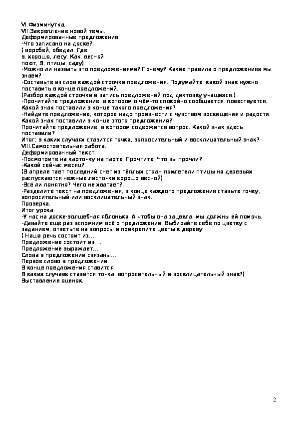 Цели: развитие умения правильно оформлять предложение в письменной речи, употреблять точку, вопросительный и восклицательный знаки в конце предложения.