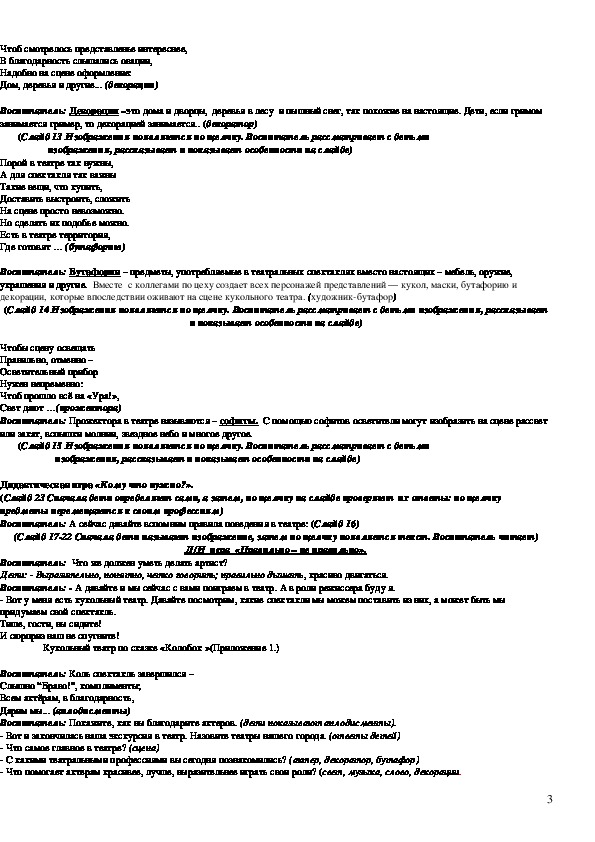 Воспитатель: А что такое театр? А для чего театр нужен людям? (Ответы детей) (подводит итого услышанному: «Во все