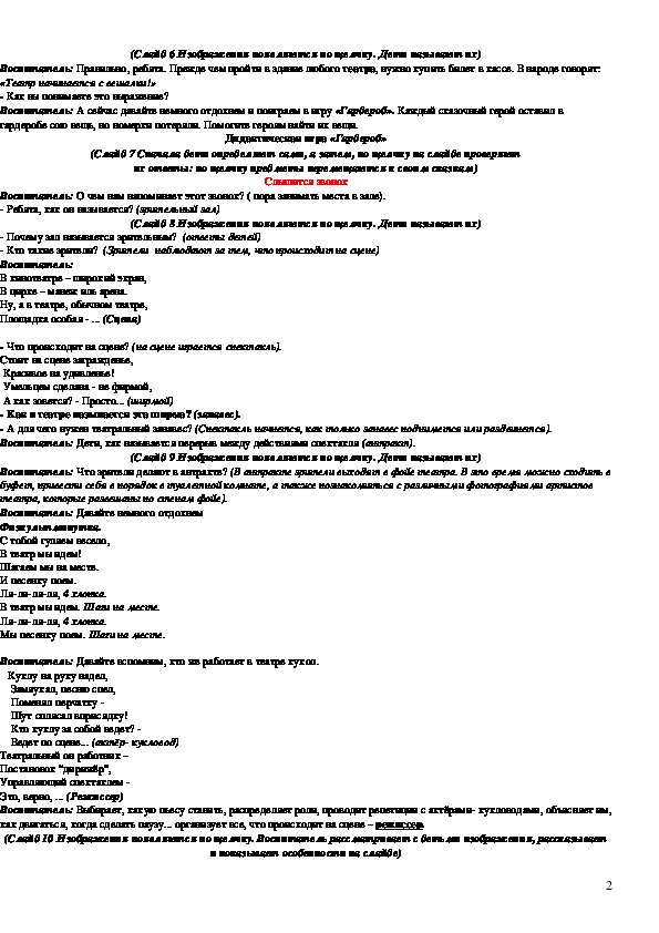 Воспитатель: А что такое театр? А для чего театр нужен людям? (Ответы детей) (подводит итого услышанному: «Во все времена люди приходили в театр отдохнуть. Туда приходят с семьей, с друзьями. Театр помогает людям быть добрее и лучше. В театре живет волшебная сказка.)