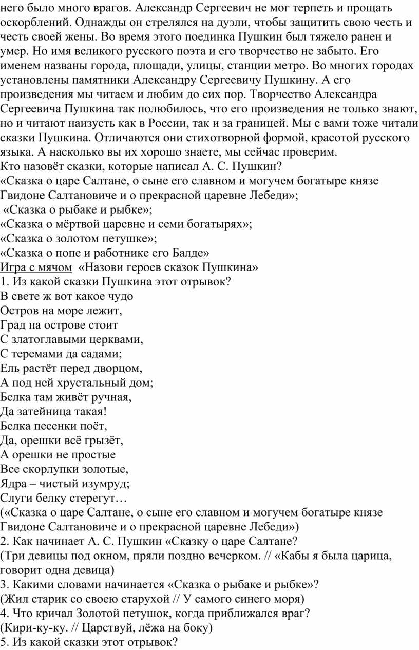 Детство его прошло в Москве. У Саши была старшая сестра и два младших брата. Отец Пушкина любил читать и сам немного писал стихи. Писатели и поэты часто приходили в гости к Пушкиным. Смышлёного мальчика нередко оставляли в гостиной, когда гости читали свои произведения. С раннего детства Саша был окружён заботой и вниманием своих родителей. Но особенно заботилась о нём его няня – Арина Родионовна. Она была мастерица петь песни и рассказывать сказки. Маленький Саша очень любил свою няню, любил слушать её необыкновенно простые и волшебные сказки. А саму Арину Родионовну он часто ласково называл «мамушкой». Когда Саша подрос, он и сам стал сочинять сказки, стихи. Подробнее о жизни А. С. Пушкина вы узнаете в школе. Я хочу вам сказать, что у Пушкина была большая семья: красавица жена, Наталья Николаевна и четверо детей. Александр Сергеевич очень любил своих детей, часто проводил с ними своё время: читал им свои стихи, играл, нежно называл их «детушки». А. С. Пушкин был честным, решительным человеком, писал смелые, правдивые стихи, в которых высмеивал глупцов, злых и нечестных людей, поэтому у него было много врагов. Александр Сергеевич не мог терпеть и прощать оскорблений. Однажды он стрелялся на дуэли, чтобы защитить свою честь и честь своей жены. Во время этого поединка Пушкин был тяжело ранен и умер. Но имя великого русского поэта и его творчество не забыто. Его именем названы города, площади, улицы, станции метро. Во многих городах установлены памятники Александру Сергеевичу Пушкину. А его произведения мы читаем и любим до сих пор. Творчество Александра Сергеевича Пушкина так полюбилось, что его произведения не только знают, но и читают наизусть как в России, так и за границей. Мы с вами тоже читали сказки Пушкина. Отличаются они стихотворной формой, красотой русского языка. А насколько вы их хорошо знаете, мы сейчас проверим.