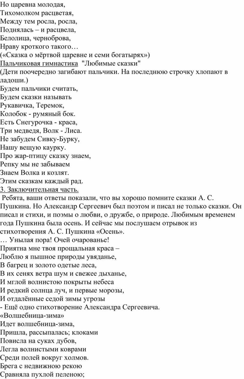 Цель: Активизировать литературную память дошкольников, создать эмоционально-положительное настроение, обогатить представления детей о жизни и творчестве А. С. Пушкина.