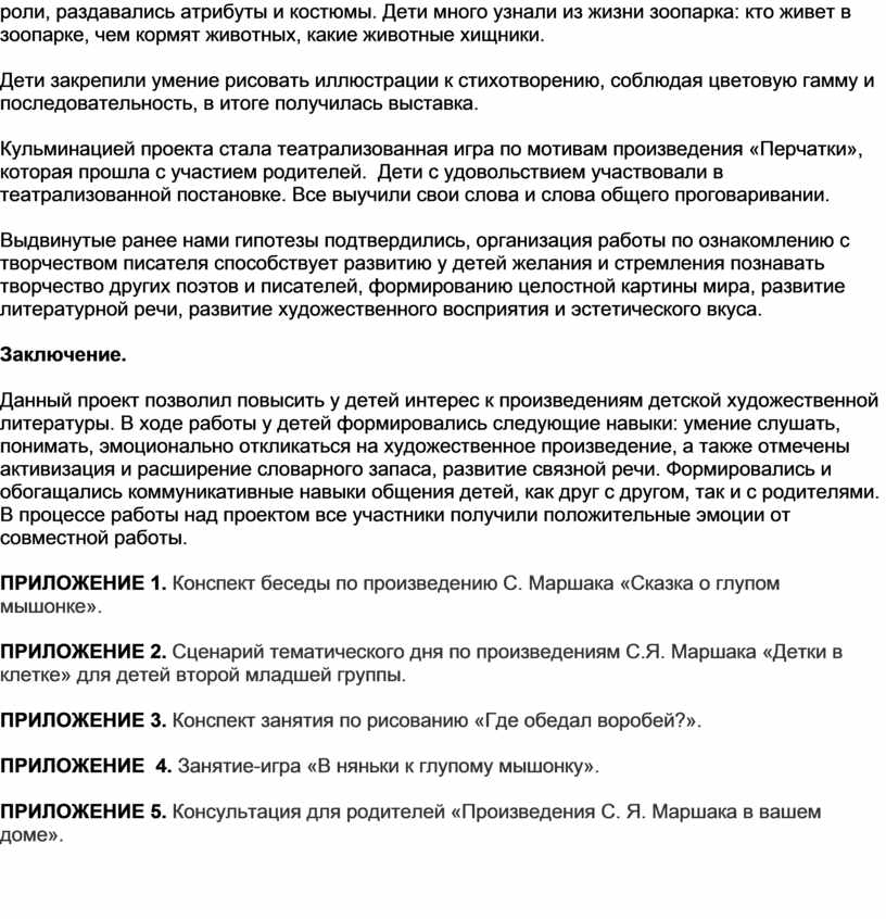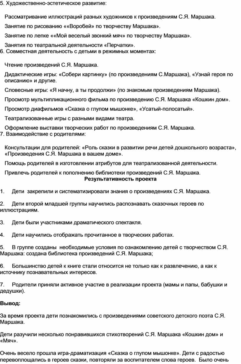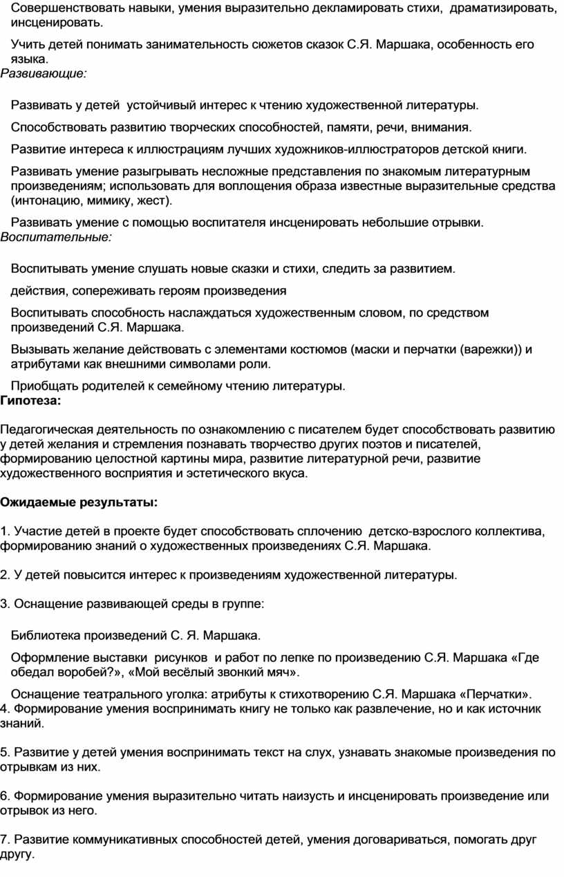 1. Участие детей в проекте будет способствовать сплочению детско-взрослого коллектива, формированию знаний о художественных произведениях С.Я. Маршака.