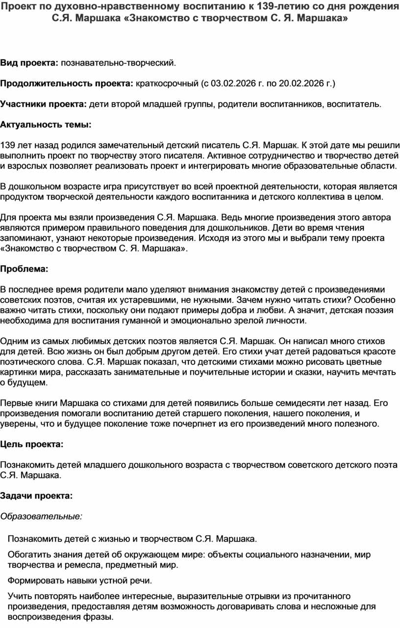 Проект по духовно-нравственному воспитанию к 139-летию со дня рождения С.Я. Маршака «Знакомство с творчеством С. Я. Маршака»