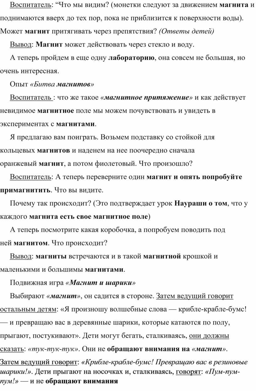 Воспитатель: “Что мы видим? (монетки следуют за движением магнита и поднимаются вверх до тех пор, пока не приблизится к поверхности воды). Может магнит притягивать через препятствия? (Ответы детей)