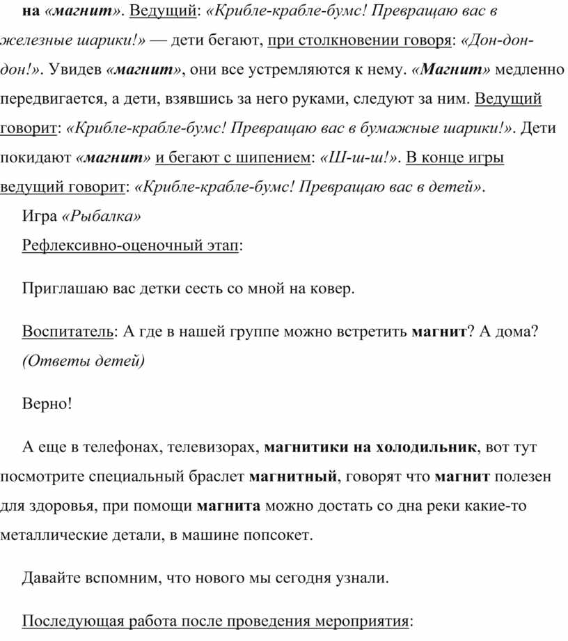Затем ведущий говорит: «Крибле-крабле-бумс! Превращаю вас в резиновые шарики!». Дети прыгают на носочках и, сталкиваясь, говорят: «Пум-пум-пум!» — и не обращают внимания на «магнит». Ведущий: «Крибле-крабле-бумс! Превращаю вас в железные шарики!» — дети бегают, при столкновении говоря: «Дон-дон-дон!». Увидев «магнит», они все устремляются к нему. «Магнит» медленно передвигается, а дети, взявшись за него руками, следуют за ним. Ведущий говорит: «Крибле-крабле-бумс! Превращаю вас в бумажные шарики!». Дети покидают «магнит» и бегают с шипением: «Ш-ш-ш!». В конце игры ведущий говорит: «Крибле-крабле-бумс! Превращаю вас в детей».