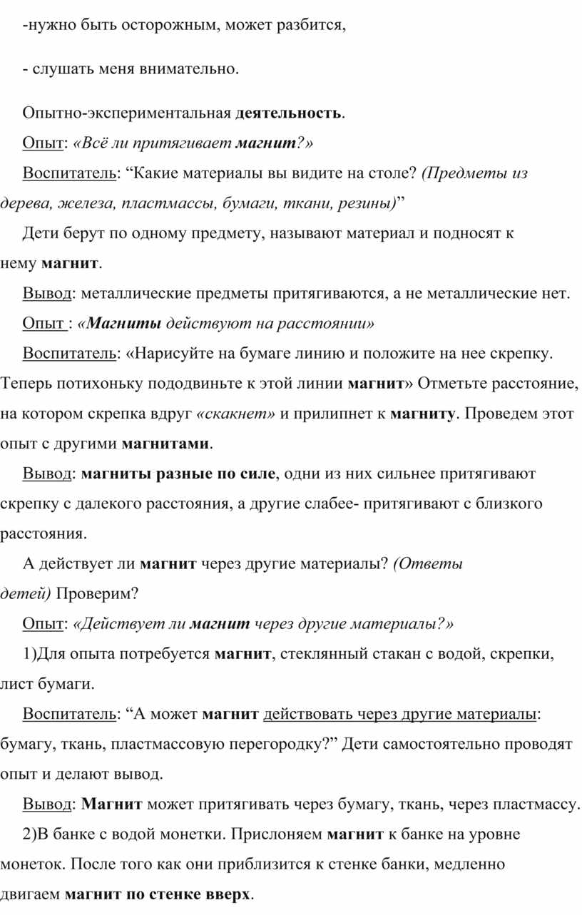 Воспитатель: “А может магнит действовать через другие материалы: бумагу, ткань, пластмассовую перегородку?” Дети самостоятельно проводят опыт и делают вывод.