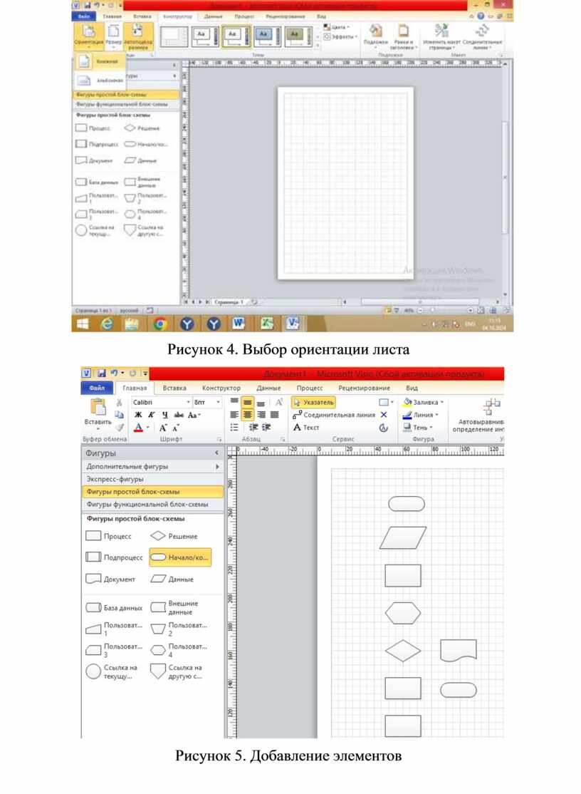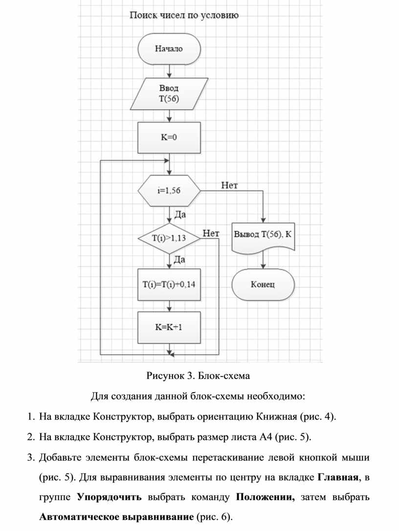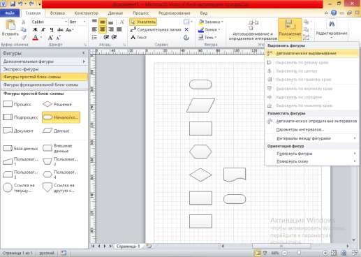5. Добавьте элементы блок-схемы перетаскивание левой кнопкой мыши (рис. 5). Для выравнивания элементы по центру на вкладке Главная, в группе Упорядочить выбрать команду Положении, затем выбрать Автоматическое выравнивание (рис. 6).