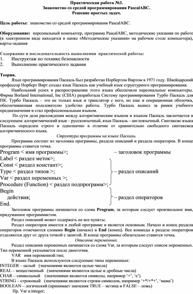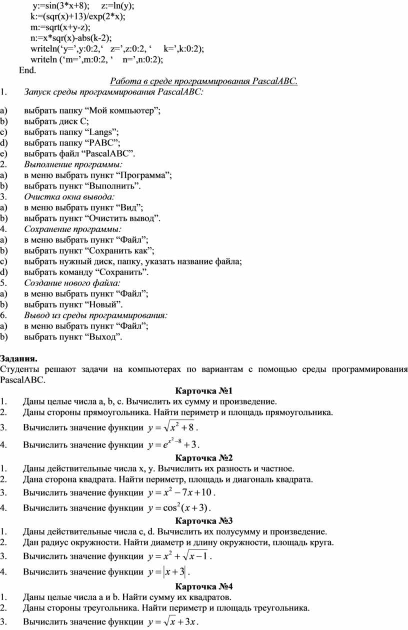 Оборудование: персональный компьютер, программа PascalABC, методические указания по работе (в электронном виде находятся в папке «Методические указания» на рабочем столе компьютера), карты-задания