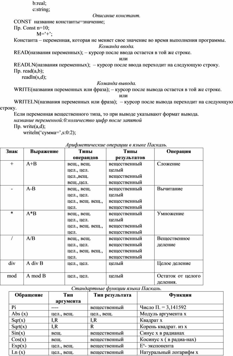 Раздел операторов имеется в любой программе и является основным. Начало и конец раздела операторов отмечаются словами Begin (начало) и End (конец). Все команды в разделе операторов отделяются друг от друга точкой с запятой. В конце программы обязательно ставится точка.