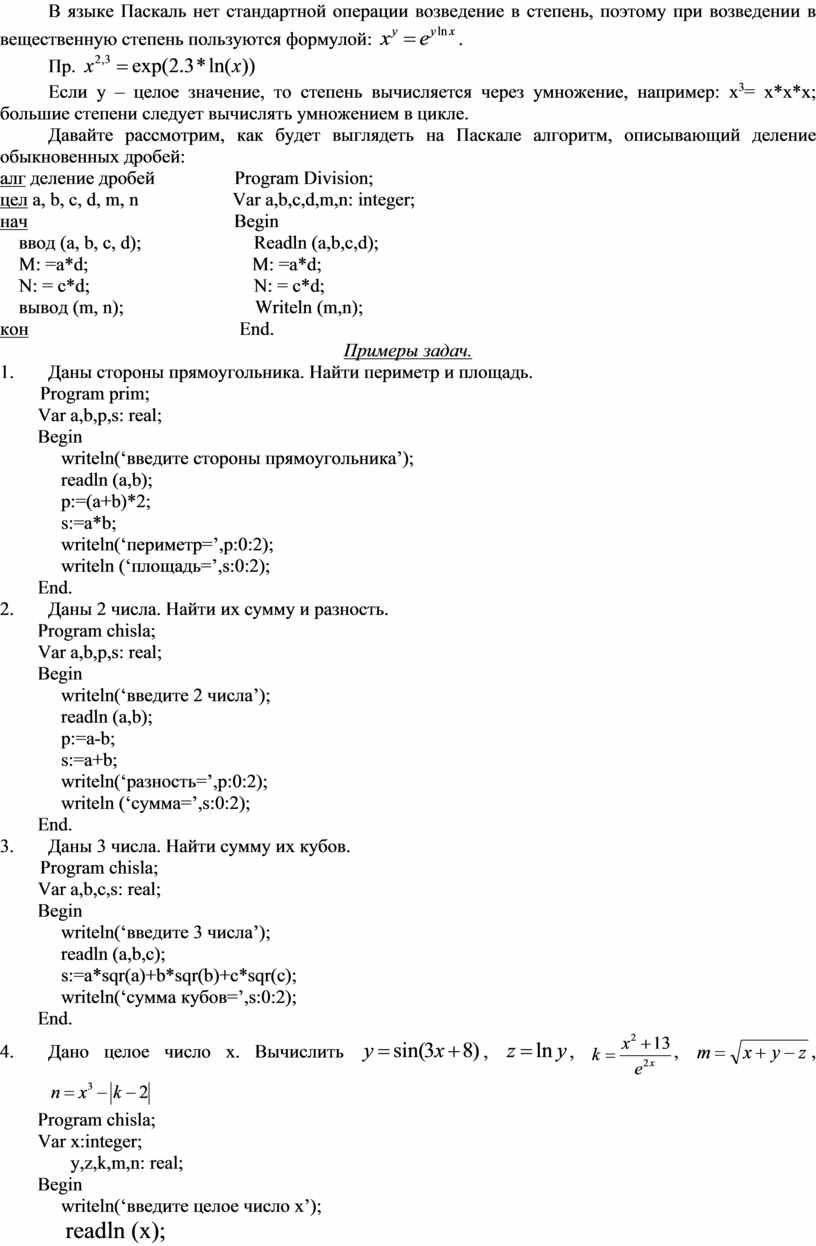 Если y – целое значение, то степень вычисляется через умножение, например: х3= х*х*х; большие степени следует вычислять умножением в цикле.