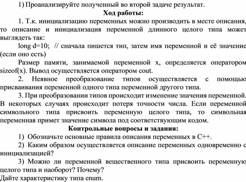 3. При преобразовании типов происходит изменение значения переменной. В некоторых случаях происходит потеря точности числа. Если переменной символьного типа присвоить переменную целого типа, то символьная переменная примет значение символа под соответствующим кодом.