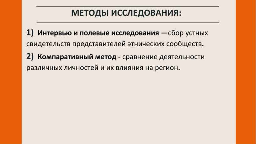 3) Интервью и полевые исследования —сбор устных свидетельств представителей этнических сообществ.
