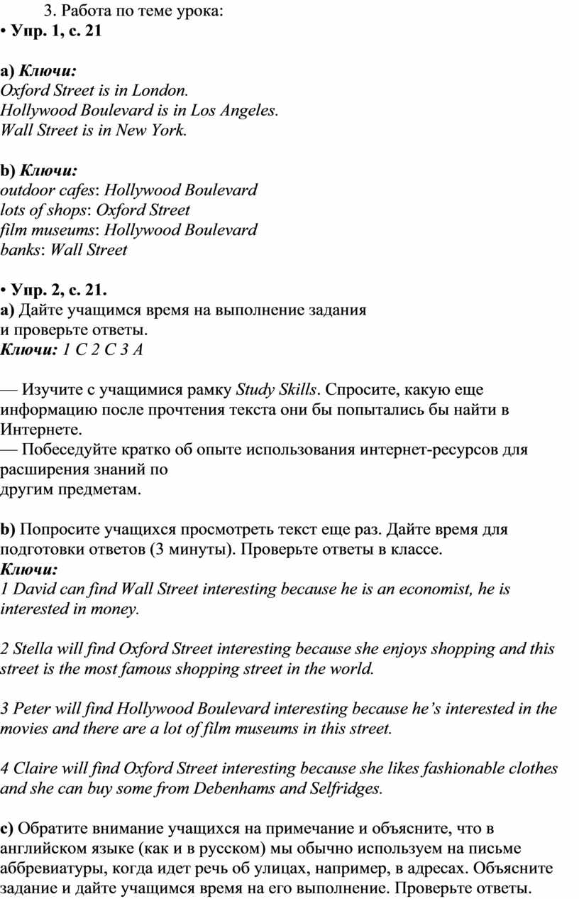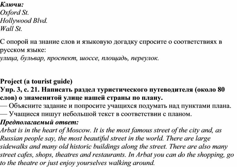 Упр. 3, с. 21. Написать раздел туристического путеводителя (около 80 слов) о знаменитой улице нашей страны по плану.