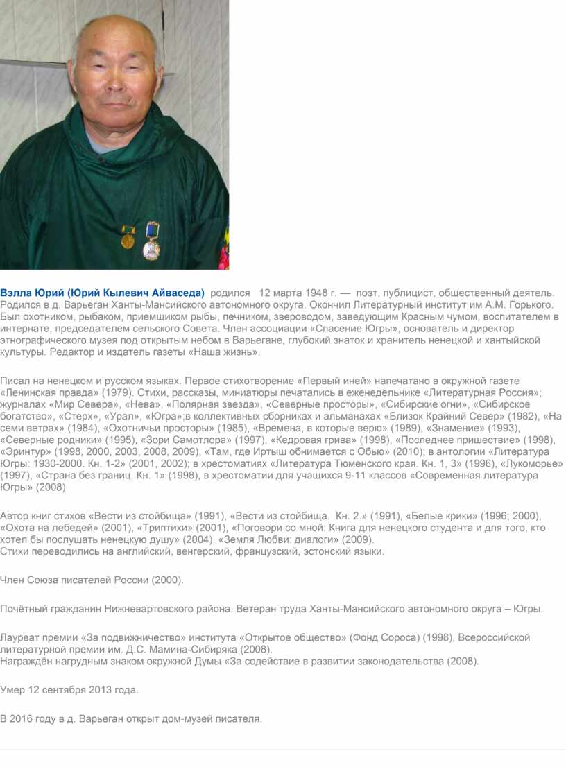 Вэлла Юрий (Юрий Кылевич Айваседа) родился 12 марта 1948 г. — поэт, публицист, общественный деятель. Родился в д. Варьеган Ханты-Мансийского автономного округа. Окончил Литературный институт им А.М. Горького. Был охотником, рыбаком, приемщиком рыбы, печником, звероводом, заведующим Красным чумом, воспитателем в интернате, председателем сельского Совета. Член ассоциации «Спасение Югры», основатель и директор этнографического музея под открытым небом в Варьегане, глубокий знаток и хранитель ненецкой и хантыйской культуры. Редактор и издатель газеты «Наша жизнь».