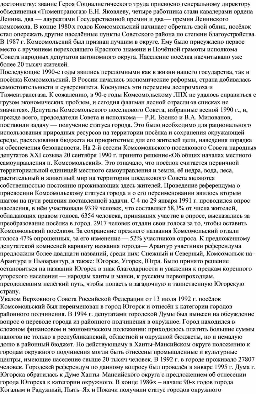Последующие 1990-е годы явились переломными как в жизни нашего государства, так и посёлка Комсомольский. В России начались экономические реформы, страна добивалась самостоятельности и суверенитета. Коснулись эти перемены леспромхоза и Тюментрансгаза. К сожалению, в 90-е годы Комсомольскому ЛПХ не удалось справиться с грузом экономических проблем, и сегодня флагман лесной отрасли «в списках не значится». Депутаты Комсомольского поселкового Совета, избранные весной 1990 г., и, прежде всего, председатели Совета и исполкома — Р.И. Бзенко и В.А. Милованов, поставили задачу — получение статуса города. Это было необходимо для рационального использования природных ресурсов на территории посёлка и сохранения окружающей среды, расходования бюджета на приоритетные для его жителей цели, наведения порядка и обеспечения безопасности. На 2-й сессии Комсомольского поселкового Совета народных депутатов ХХI созыва 20 сентября 1990 г. принято решение «Об общих началах местного самоуправления п. Комсомольский». Это означало, что посёлок считается первичной территориальной единицей местного самоуправления и земля, её недра, вода, леса, растительный и животный мир на территории поселкового Совета являются собственностью постоянно проживающих здесь жителей. Проведение референдума о присвоении Комсомольскому статуса города и о его переименовании явилось вторым шагом на пути решения поставленной задачи. С 4 по 29 января 1991 г. проводился опрос населения, в нём участвовали 9339 человек, что составляет 58,3% от числа жителей, обладающих правом голоса. 6354 человека, принявших участие в опросе, высказались за преобразование посёлка в город. 2917 человек отдали свои голоса за то, чтобы оставить Комсомольский посёлком. За сохранение прежнего названия Комсомольский отдали голоса 47% опрошенных, за его изменение — 52% участников опроса. К предложенному депутатской комиссией варианту названия города — Арантур участники референдума предложили более двадцати названий, среди них: Снежный и Северный, Комсомольск–на–Арантуре и Ньюарантур, а также: Югорск, Угорск, Югра. Было принято решение остановиться на названии Югорск в знак благодарности и уважения к предкам коренного угорского населения — народам ханты и манси, к русским первопроходцам, преодолевшим нелёгкий путь, чтобы попасть в загадочную и таинственную Югорскую страну.