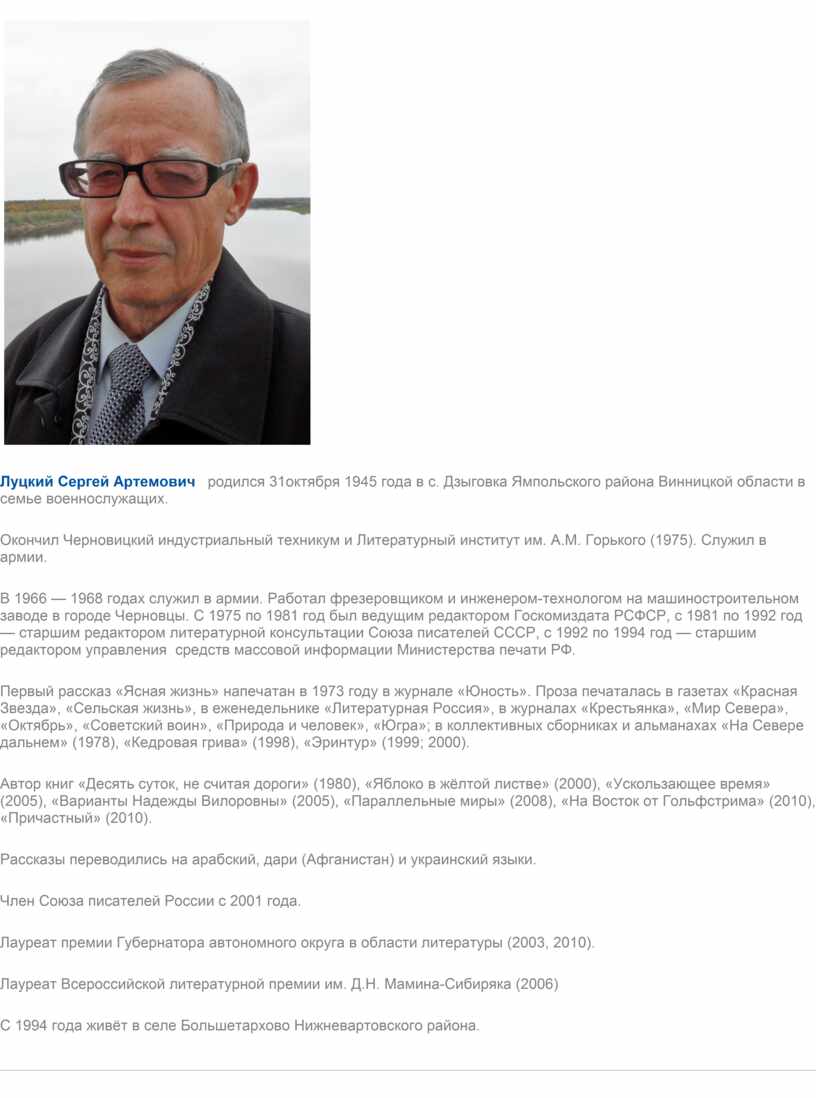 Луцкий Сергей Артемович родился 31октября 1945 года в с. Дзыговка Ямпольского района Винницкой области в семье военнослужащих.
