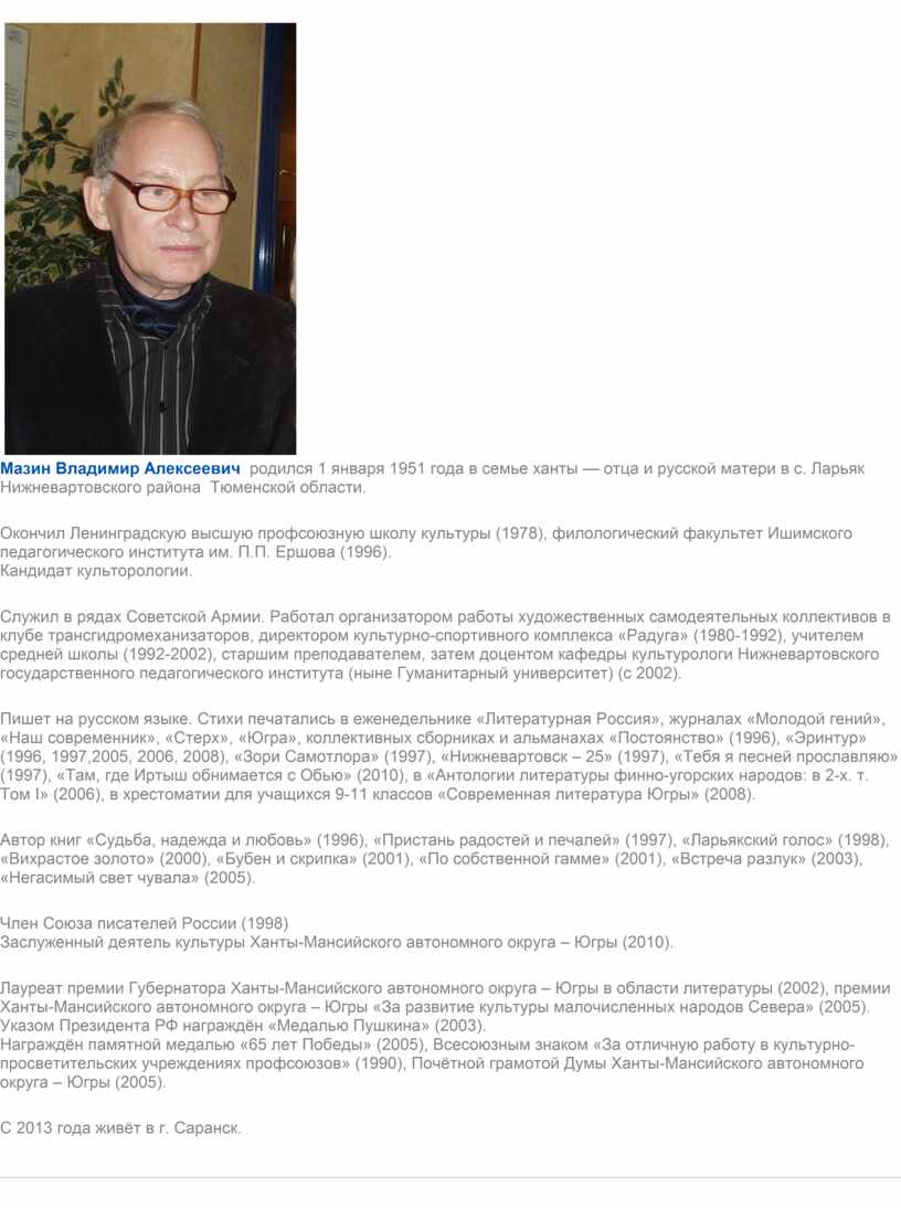 Ханты-Мансийского автономного округа – Югры в области литературы (2002), премии