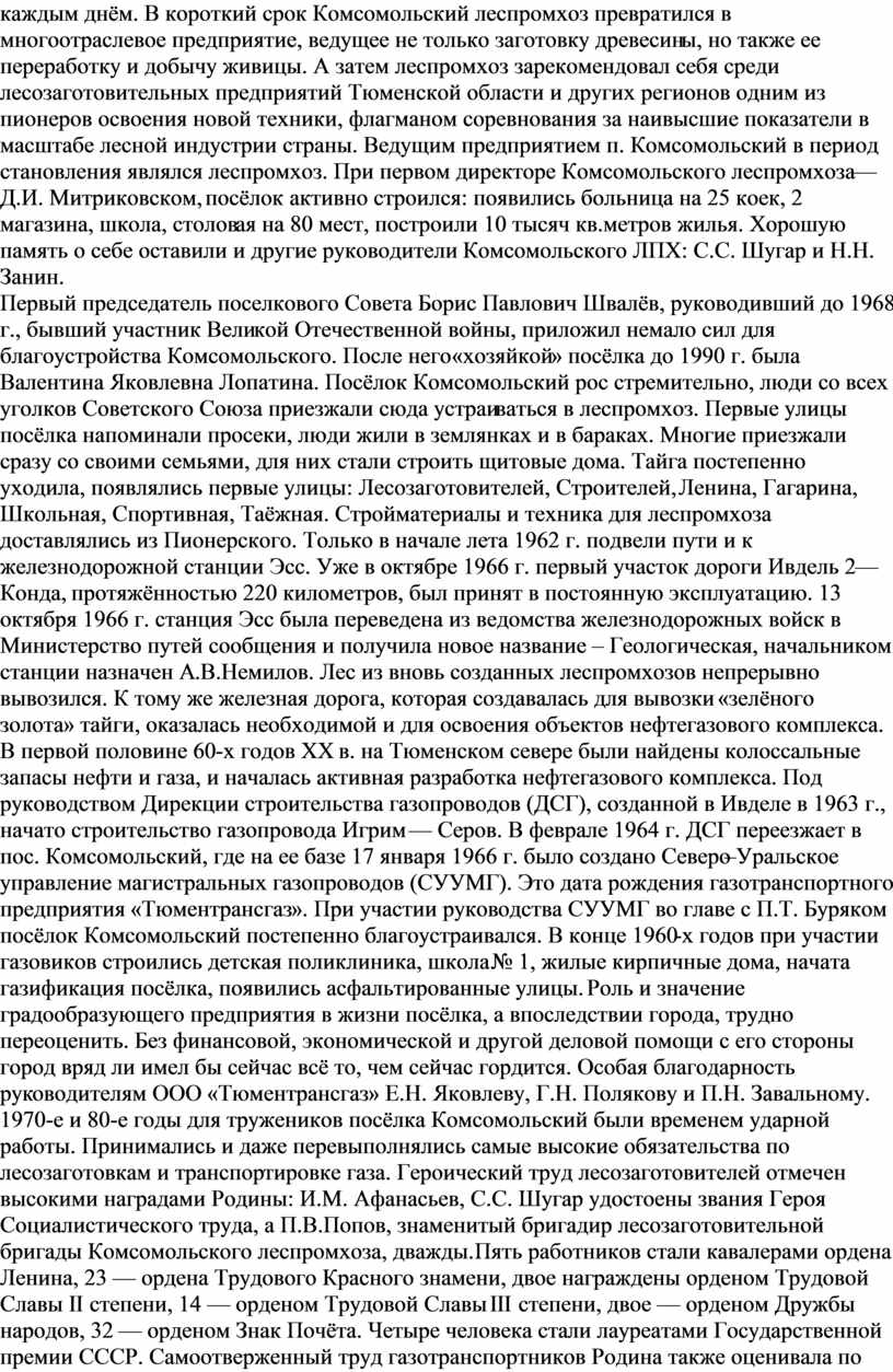 В первой половине 60-х годов ХХ в. на Тюменском севере были найдены колоссальные запасы нефти и газа, и началась активная разработка нефтегазового комплекса. Под руководством Дирекции строительства газопроводов (ДСГ), созданной в Ивделе в 1963 г., начато строительство газопровода Игрим — Серов. В феврале 1964 г. ДСГ переезжает в пос. Комсомольский, где на ее базе 17 января 1966 г. было создано Северо–Уральское управление магистральных газопроводов (СУУМГ). Это дата рождения газотранспортного предприятия «Тюментрансгаз». При участии руководства СУУМГ во главе с П.Т. Буряком посёлок Комсомольский постепенно благоустраивался. В конце 1960-х годов при участии газовиков строились детская поликлиника, школа № 1, жилые кирпичные дома, начата газификация посёлка, появились асфальтированные улицы. Роль и значение градообразующего предприятия в жизни посёлка, а впоследствии города, трудно переоценить. Без финансовой, экономической и другой деловой помощи с его стороны город вряд ли имел бы сейчас всё то, чем сейчас гордится. Особая благодарность руководителям ООО «Тюментрансгаз» Е.Н. Яковлеву, Г.Н. Полякову и П.Н. Завальному.