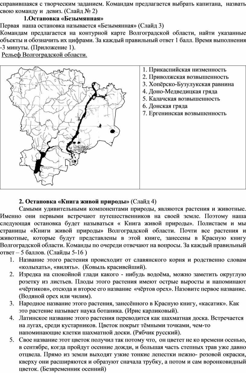 Командам предлагается на контурной карте Волгоградской области, найти указанные объекты и обозначить их цифрами. За каждый правильный ответ 1 балл. Время выполнения -3 минуты. (Приложение 1).