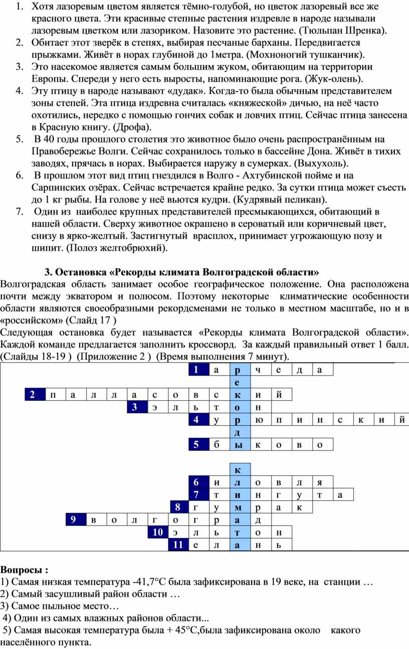 Следующая остановка будет называется «Рекорды климата Волгоградской области». Каждой команде предлагается заполнить кроссворд. За каждый правильный ответ 1 балл. (Слайды 18-19 ) (Приложение 2 ) (Время выполнения 7 минут).