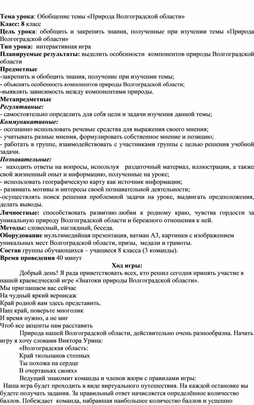 Оборудование мультимедийная презентация, ватман А3, картинки с изображением уникальных мест Волгоградской области, призы, медали и грамоты. Состав группы обучающихся – учащиеся 8 класса (3 команды).