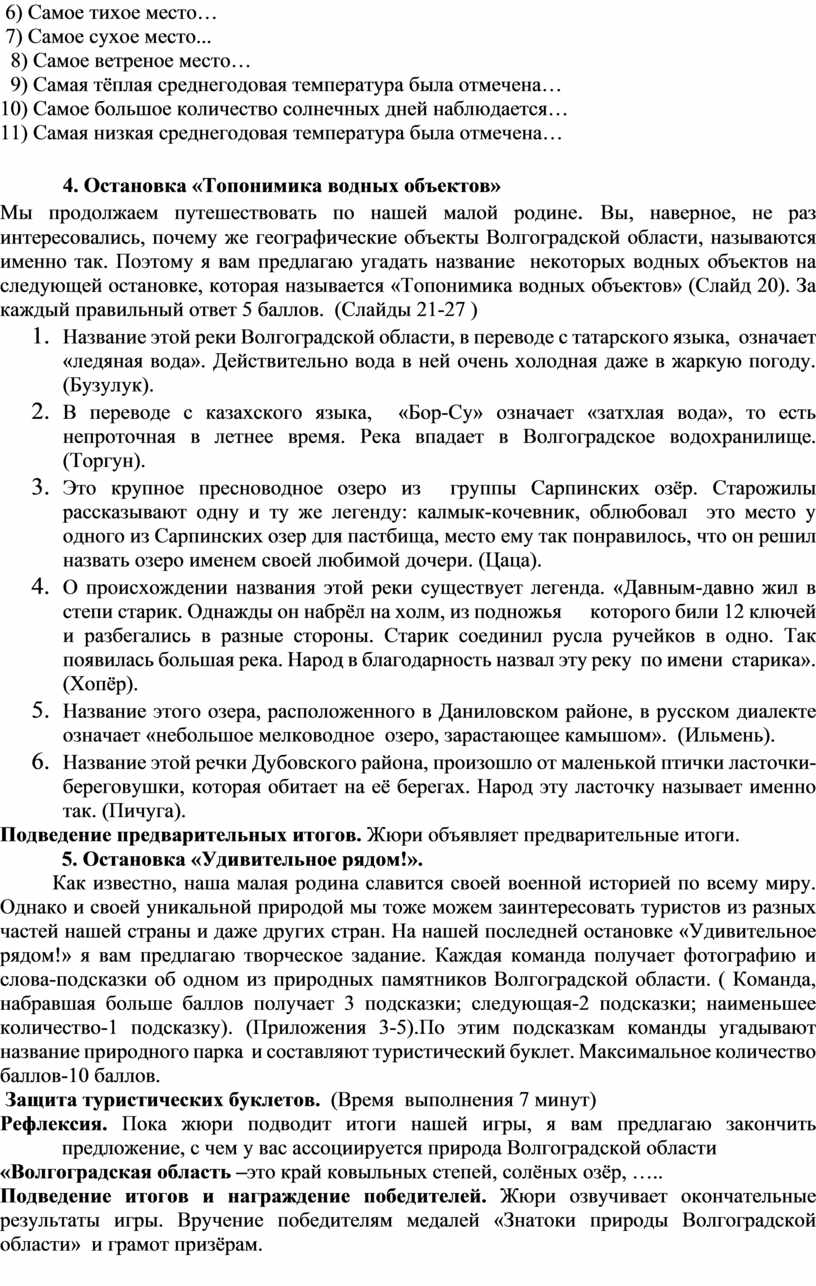 Как известно, наша малая родина славится своей военной историей по всему миру. Однако и своей уникальной природой мы тоже можем заинтересовать туристов из разных частей нашей страны и даже других стран. На нашей последней остановке «Удивительное рядом!» я вам предлагаю творческое задание. Каждая команда получает фотографию и слова-подсказки об одном из природных памятников Волгоградской области. ( Команда, набравшая больше баллов получает 3 подсказки; следующая-2 подсказки; наименьшее количество-1 подсказку). (Приложения 3-5).По этим подсказкам команды угадывают название природного парка и составляют туристический буклет. Максимальное количество баллов-10 баллов.