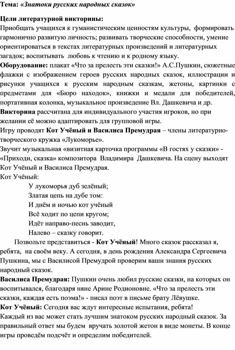 Оборудование: плакат «Что за прелесть эти сказки!» А.С.Пушкин, сюжетные флажки с изображением героев русских народных сказок, иллюстрации и рисунки учащихся к русским народным сказкам, жетоны, картинки с предметами для «Бюро находок», книжки и медали для победителей, портативная колонка, музыкальное произведение Вл. Дашкевича и др.
