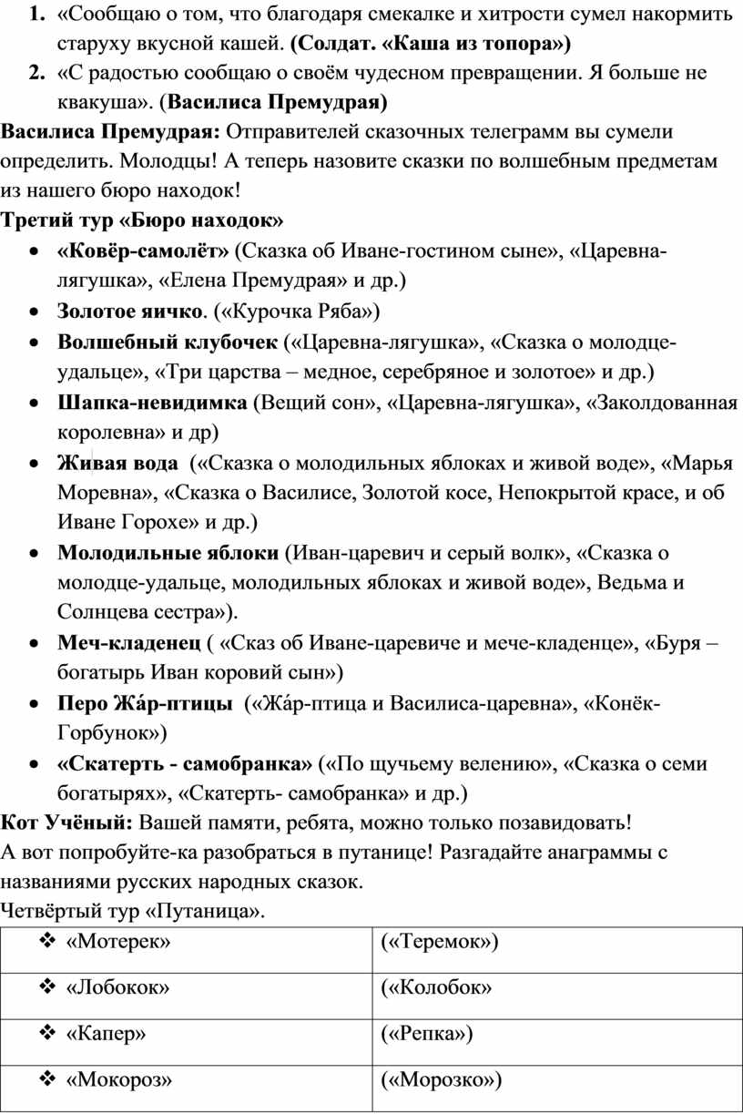Василиса Премудрая: Отправителей сказочных телеграмм вы сумели определить. Молодцы! А теперь назовите сказки по волшебным предметам из нашего бюро находок!