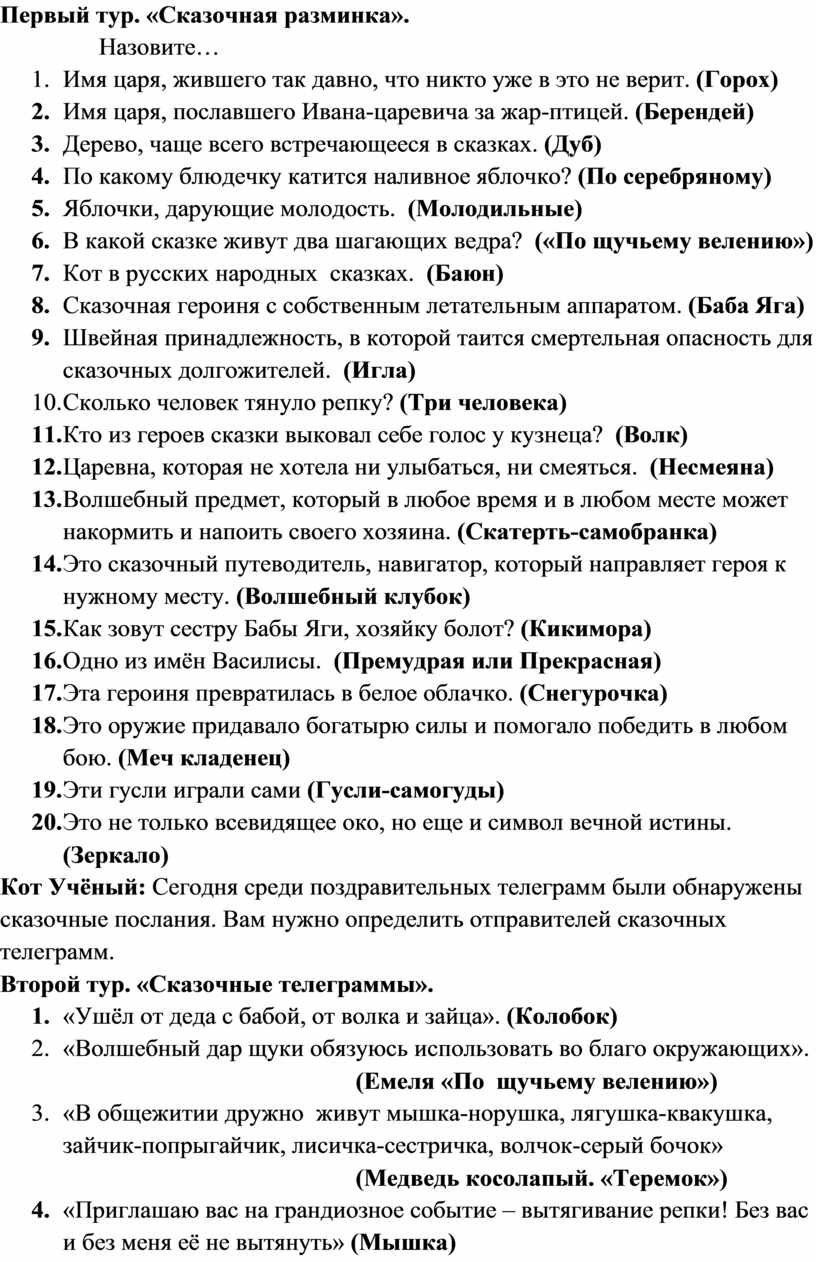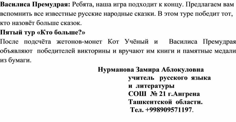 Василиса Премудрая: Ребята, наша игра подходит к концу. Предлагаем вам вспомнить все известные русские народные сказки. В этом туре победит тот, кто назовёт больше сказок.