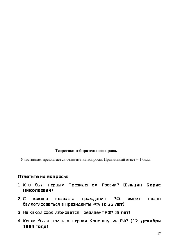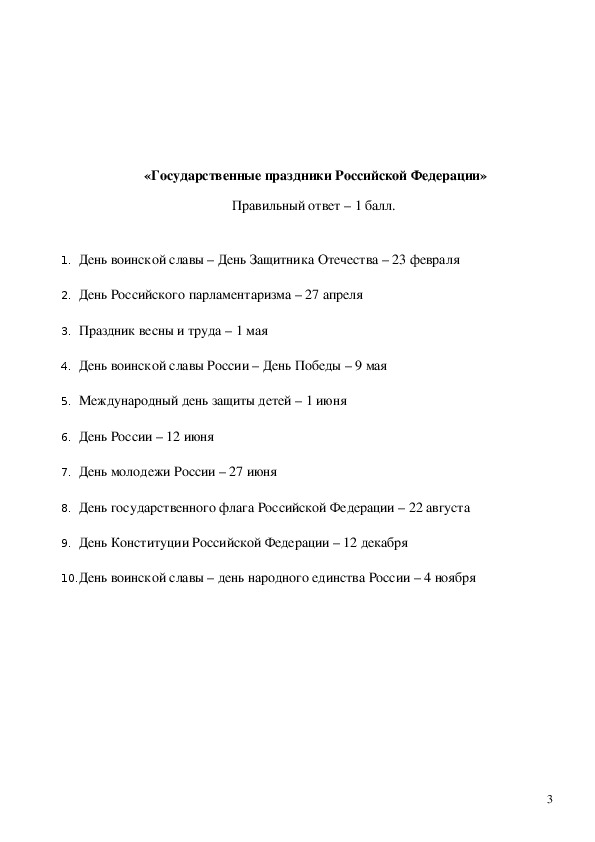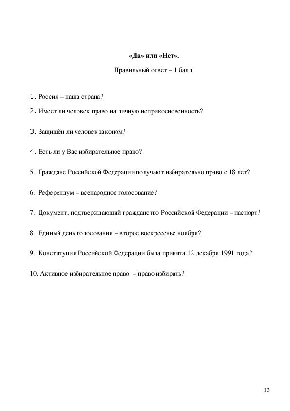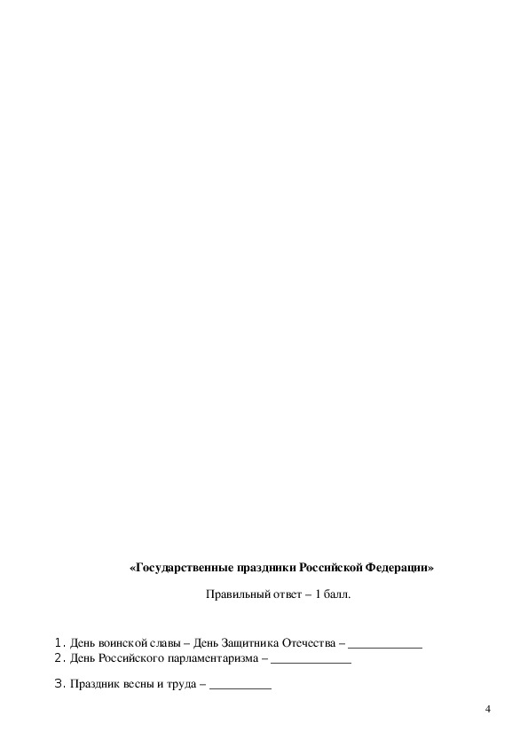 Участникам предлагается ответить на вопросы. Правильный ответ – 1 балл.