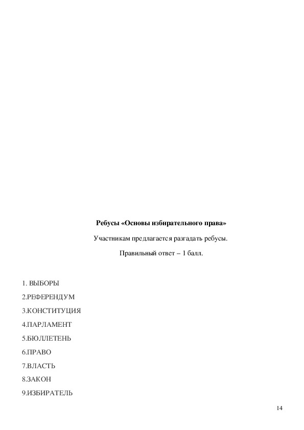 Квест "Знатоки избирательного права"включает задания по 7 направлениям: Государственные праздники Российской Федерации, Анаграммы избирательного права, Теоретики избирательного права, Сказка – право, Выборы в лицах, Ребусы, «Да» или «Нет».Квест «Знатоки избирательного права»