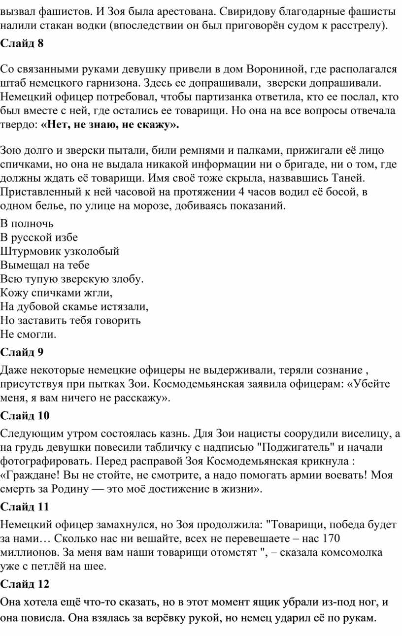 Немецкий офицер замахнулся, но Зоя продолжила: "Товарищи, победа будет за нами… Сколько нас ни вешайте, всех не перевешаете – нас 170 миллионов. За меня вам наши товарищи отомстят ", – сказала комсомолка уже с петлёй на шее.