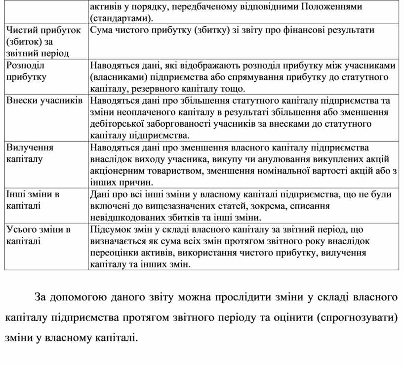 За допомогою даного звіту можна прослідити зміни у складі власного капіталу підприємства протягом звітного періоду та оцінити (спрогнозувати) зміни у власному капіталі.