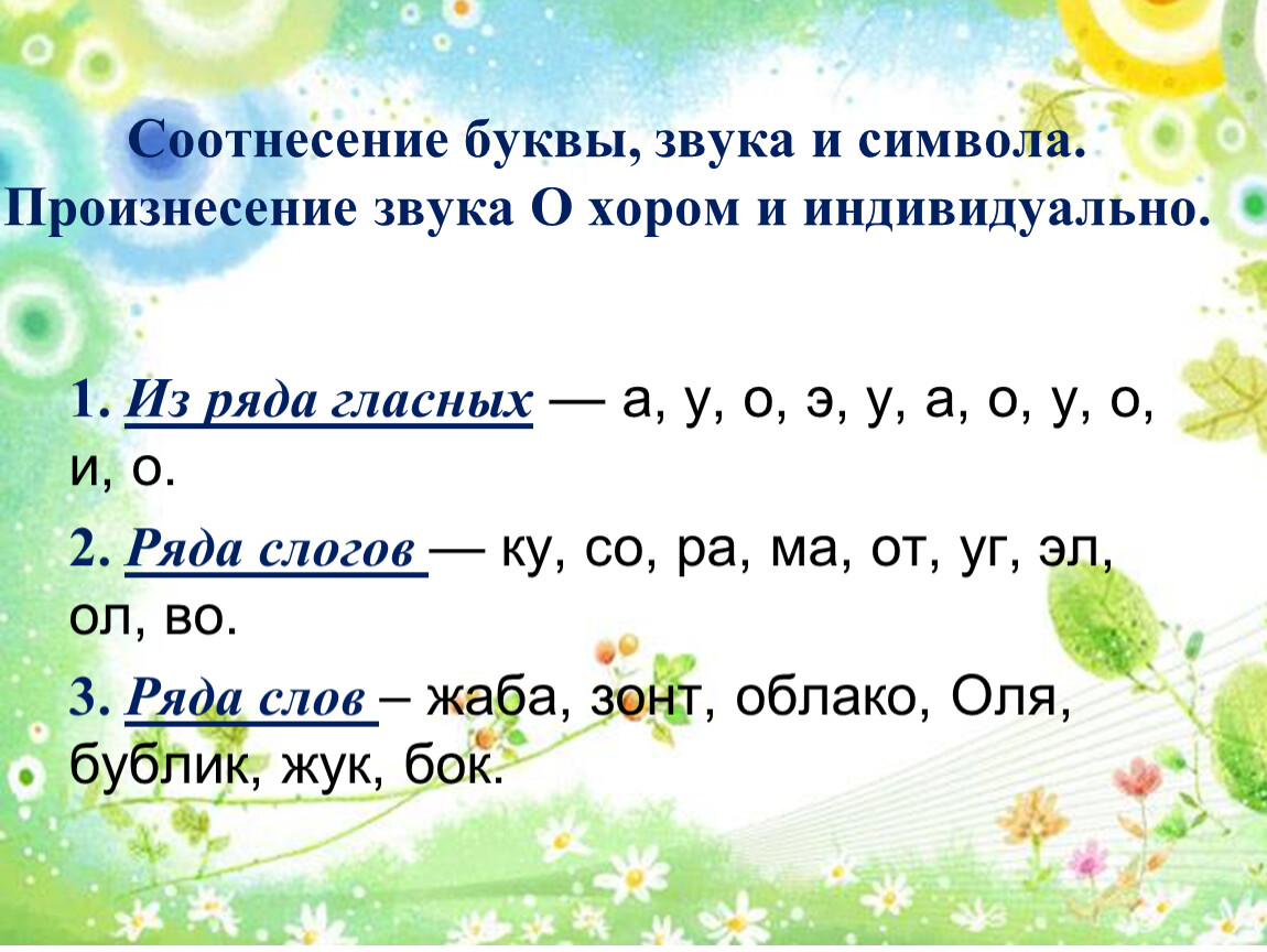 Соотнесение буквы, звука и символа. Произнесение звука О хором и индивидуально.