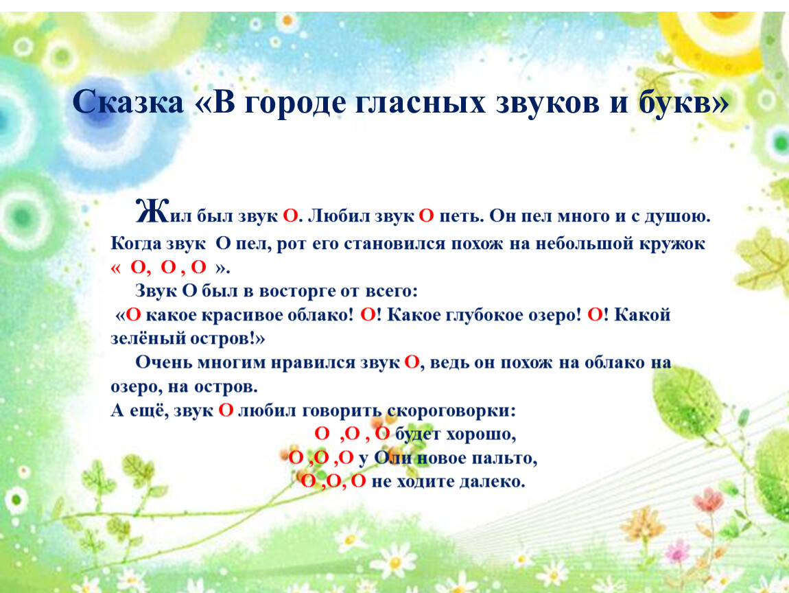 Жил был звук О. Любил звук О петь. Он пел много и с душою. Когда звук О пел, рот его становился похож на небольшой кружок « О, О , О ».