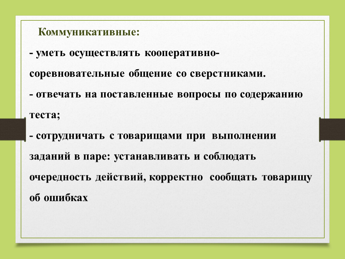 - сотрудничать с товарищами при выполнении заданий в паре: устанавливать и соблюдать очередность действий, корректно сообщать товарищу об ошибках