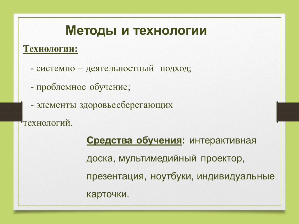 Средства обучения: интерактивная доска, мультимедийный проектор, презентация, ноутбуки, индивидуальные карточки.
