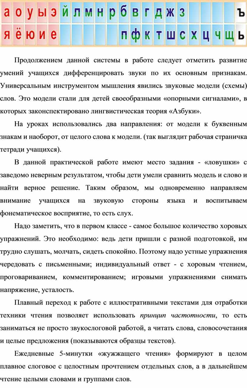 Продолжением данной системы в работе следует отметить развитие умений учащихся дифференцировать звуки по их основным признакам. Универсальным инструментом мышления явились звуковые модели (схемы) слов. Это модели стали для детей своеобразными «опорными сигналами», в которых законспектировано лингвистическая теория «Азбуки».