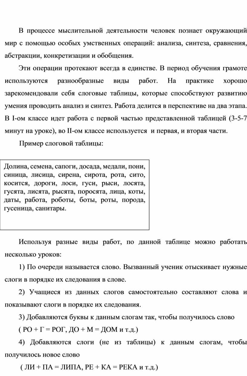 Эти операции протекают всегда в единстве. В период обучения грамоте используются разнообразные виды работ. На практике хорошо зарекомендовали себя слоговые таблицы, которые способствуют развитию умения проводить анализ и синтез. Работа делится в перспективе на два этапа. В I-ом классе идет работа с первой частью представленной таблицей (3-5-7 минут на уроке), во II-ом классе используется и первая, и вторая части.