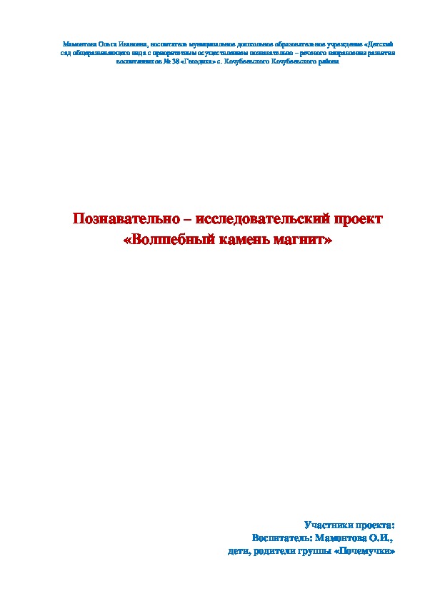 Обложка для материала Познавательно – исследовательский проект «Волшебный камень магнит»