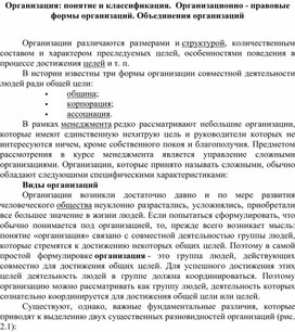 Обложка для материала Организация: понятие и классификация.  Организационно - правовые формы организаций. Объединения организаций