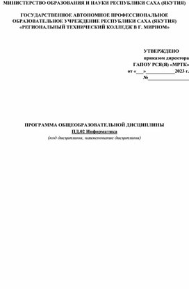 Рабочая программа ПД.02 Информатика по специальности 27.02.04 Автоматические системы управления.
