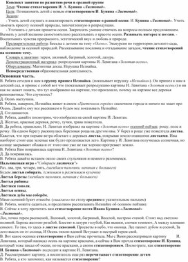 Конспект занятия по развитию речи в средней группе: Чтение стихотворения И. А. Бунина «Листопад».